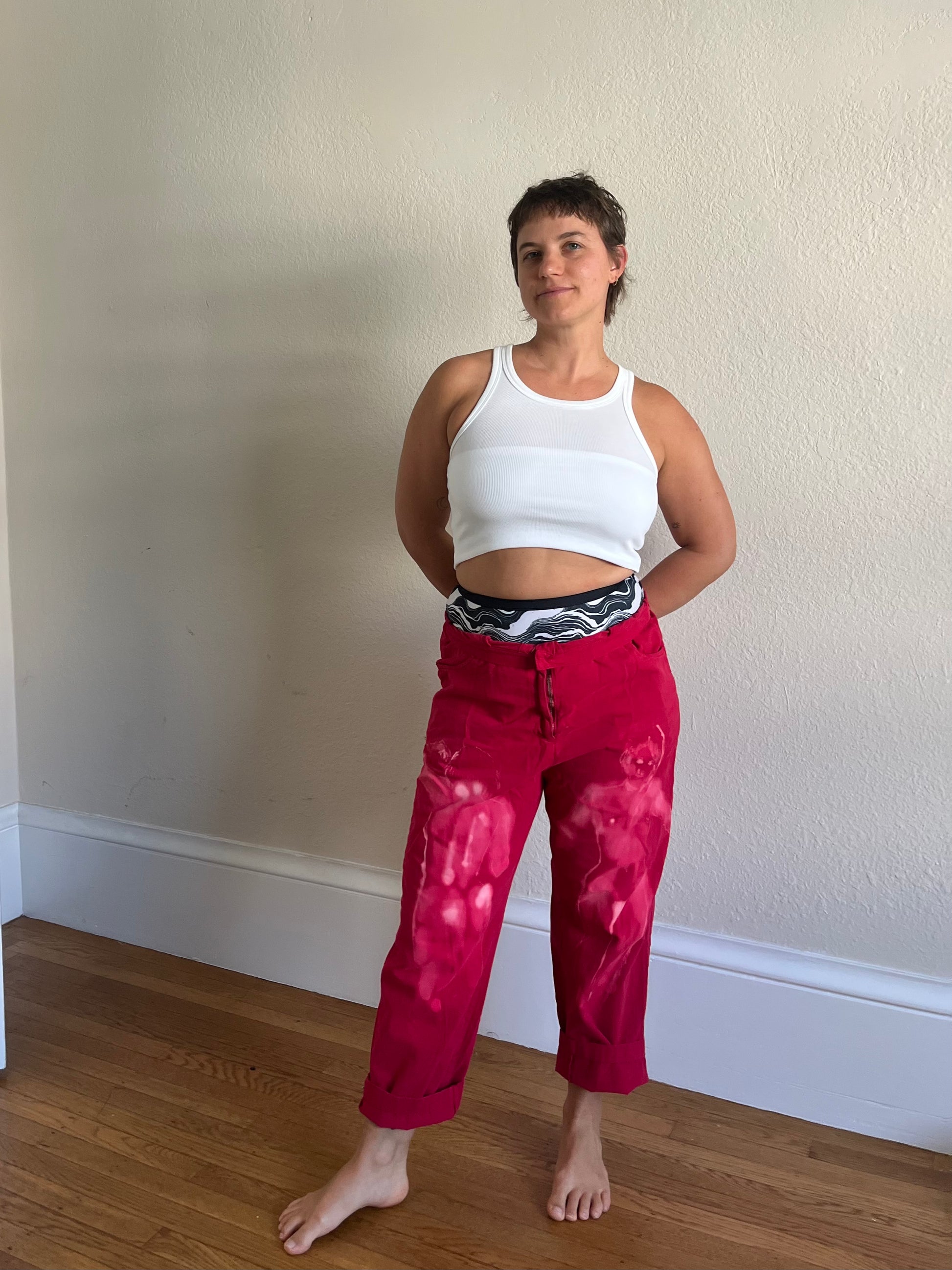 Upcycled pants with original bleach artwork by @ignacioercole.art . Only pair available: size M, 100% cotton.